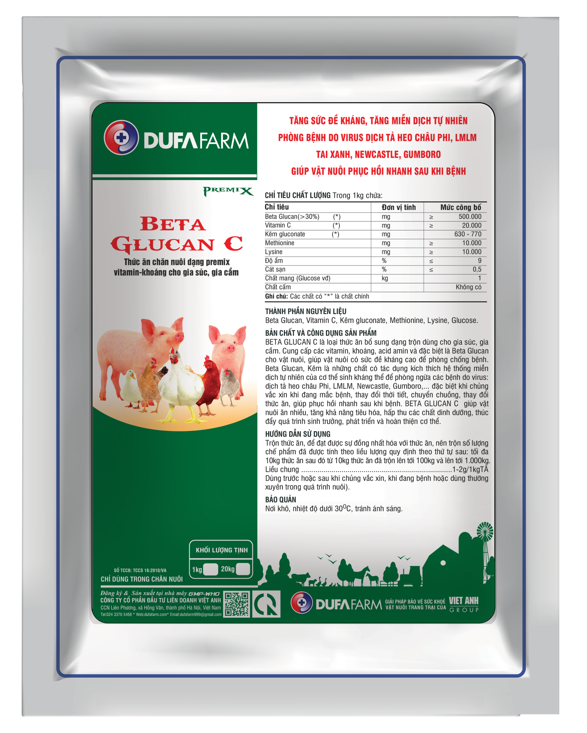 – BETA GLUCAN C là loại thức ăn bổ sung dạng trộn dùng cho gia súc, gia cầm. Cung cấp các vitamin, khoáng, acid amin và đặc biệt là Beta Glucan cho vật nuôi, giúp vật nuôi có sức đề kháng cao để phòng chống bệnh. Beta Glucan, Kẽm là những chất có tác dụng kích thích hệ thống miễn dịch tự nhiên của cơ thể sinh kháng thể để phòng ngừa các bệnh do virus: dịch tả heo châu Phi, LMLM, Newcastle, Gumboro,… đặc biệt khi chủng vắc xin khi đang mắc bệnh, thay đổi thời tiết, chuyển chuồng, thay đổi thức ăn, giúp phục hồi nhanh sau khi bệnh.
