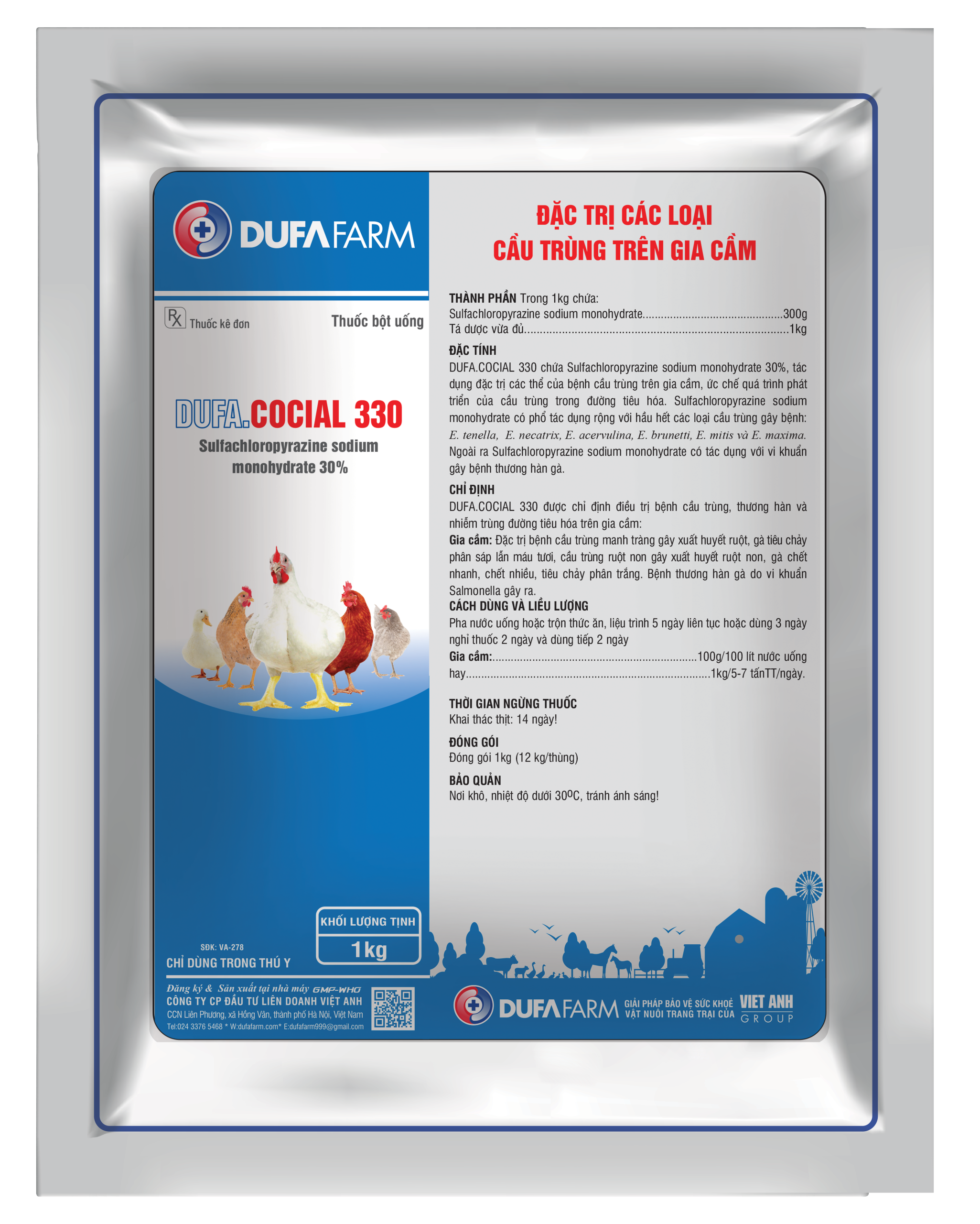 DUFA.COCIAL 330 chứa Sulfachloropyrazine sodium monohydrate 30%, tác dụng đặc trị các thể của bệnh cầu trùng trên gia cầm, ức chế quá trình phát triển của cầu trùng trong đường tiêu hóa. Sulfachloropyrazine sodium monohydrate có phổ tác dụng rộng với hầu hết các loại cầu trùng gây bệnh: E. tenella, E. necatrix, E. acervulina, E. brunetti, E. mitis và E. maxima. Ngoài ra Sulfachloropyrazine sodium monohydrate có tác dụng với vi khuẩn gây bệnh thương hàn gà.