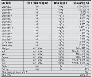 Vitamin A, D3, E, B2, B1, K3, B6, B12, B9, B3, B5, C; L- Carnitine; Methionine; Mangan; Kali; Kẽm; Coban; Sắt; Natri.