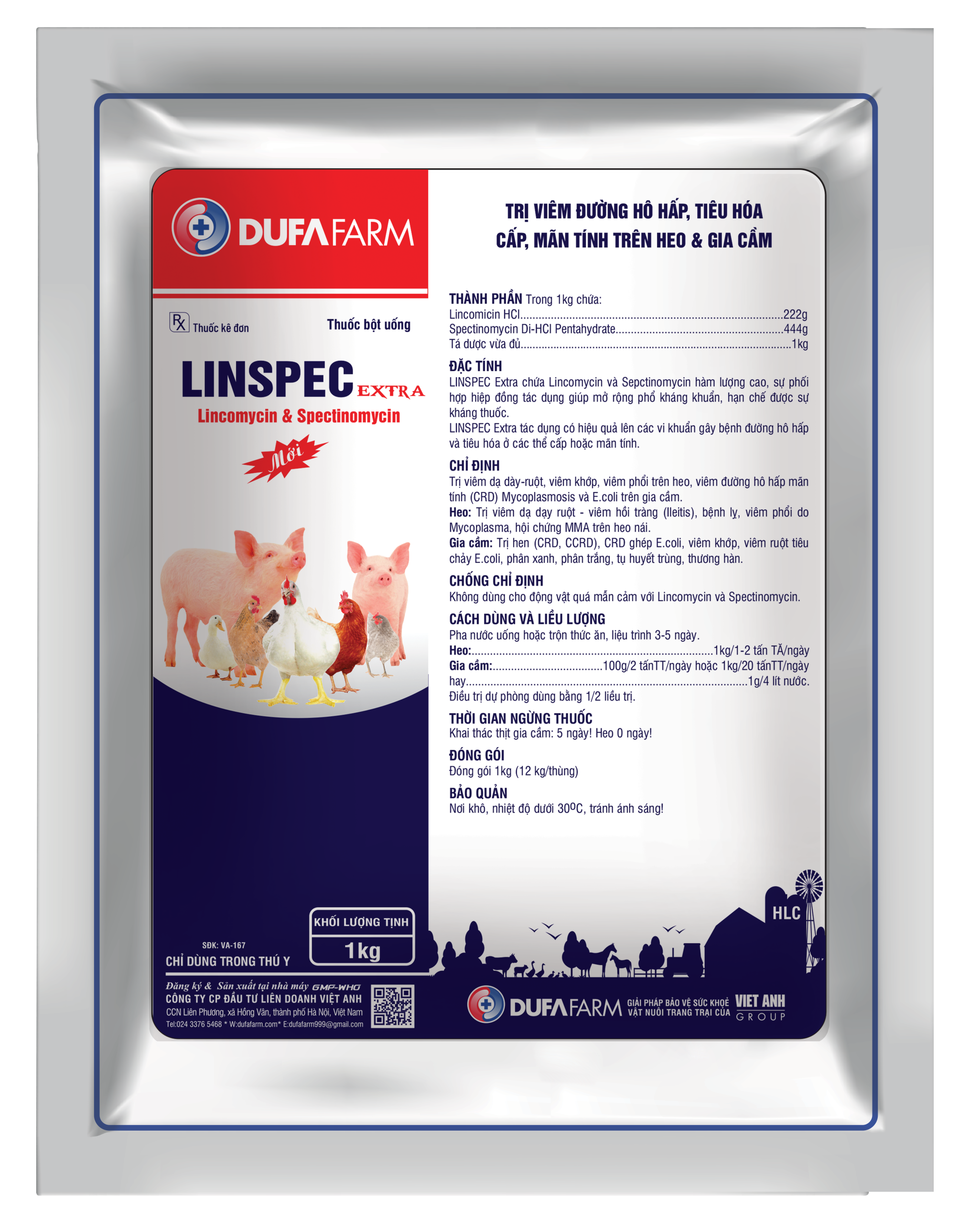 LINSPEC Extra tác dụng có hiệu quả lên các vi khuẩn gây bệnh đường hô hấp và tiêu hóa ở các thể cấp hoặc mãn tính.