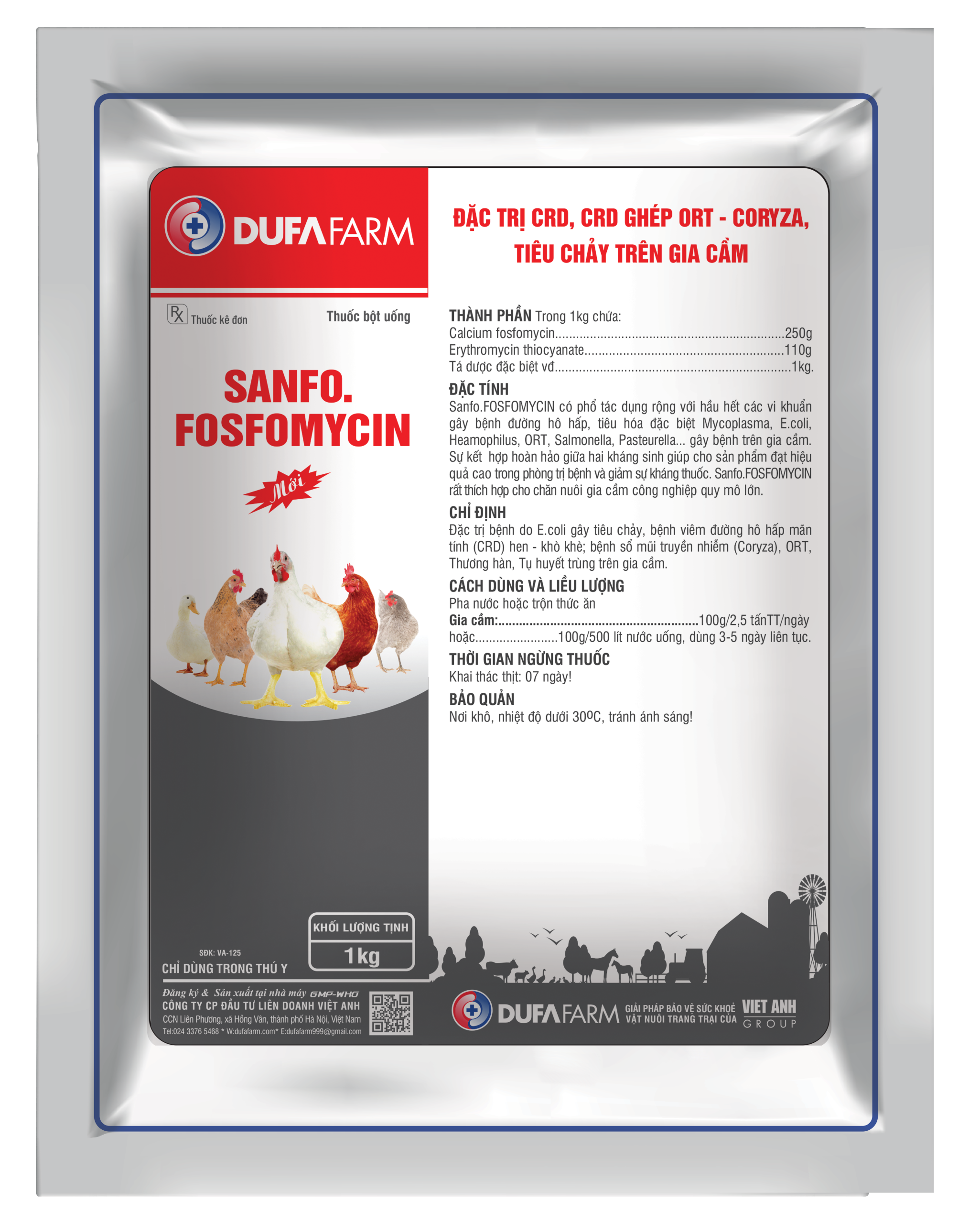 Sanfo.FOSFOMYCIN có phổ tác dụng rộng với hầu hết các vi khuẩn gây bệnh đường hô hấp, tiêu hóa đặc biệt Mycoplasma, E.coli, Heamophilus, ORT, Salmonella, Pasteurella… gây bệnh trên gia cầm. Sự kết hợp hoàn hảo giữa hai kháng sinh giúp cho sản phẩm đạt hiệu quả cao trong phòng trị bệnh và giảm sự kháng thuốc. Sanfo.FOSFOMYCIN rất thích hợp cho chăn nuôi gia cầm công nghiệp quy mô lớn.